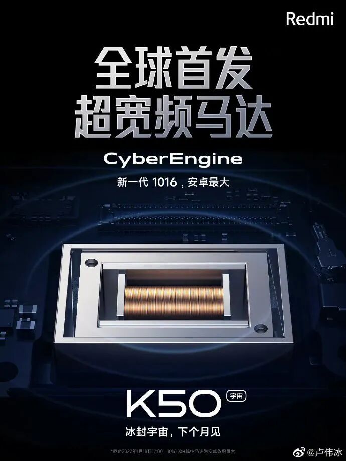 小米卢伟冰今天表示,Redmi K50 宇宙全球首发 CyberEngine 超宽频马达,代号 1016,可能是安卓史上最强 X 轴马达振感。(来源:IT之家)