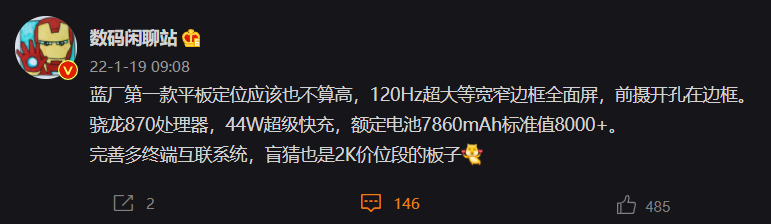 有消息称,vivo 的首款平板电脑将于 2022 年推出,搭载一代神 U 骁龙 870。