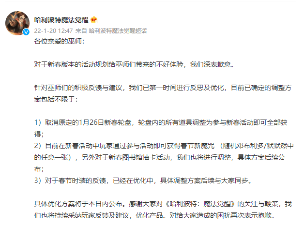 随后 @哈利波特魔法觉醒 官博发文道歉,给出目前的调整方案,并称将对游戏进行优化。