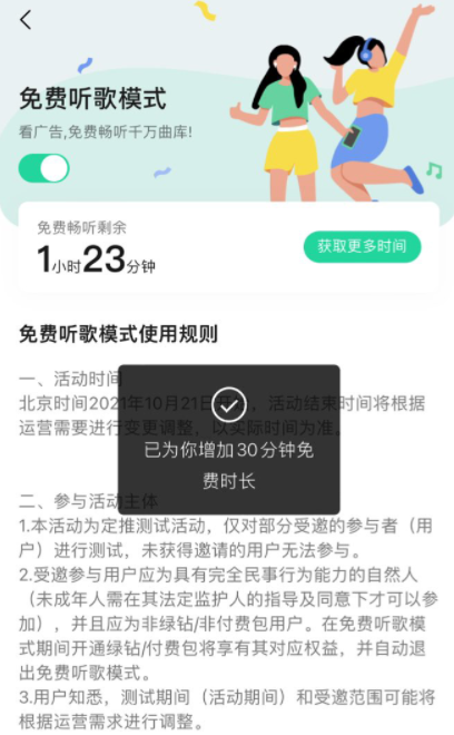 此外,QQ 音乐 App 开始测试看广告免费听歌模式,仅限部分受邀用户。看一次广告可免费听 30 分钟,多看多累计。