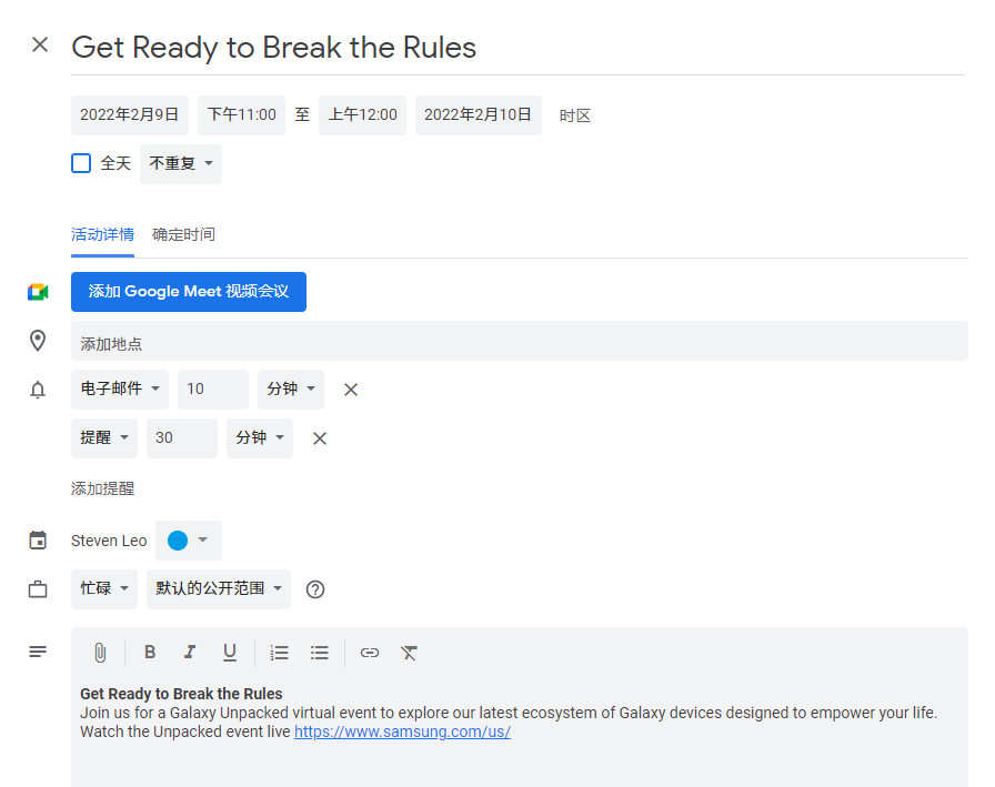 据了解,打开该链接后,会跳转到谷歌的日历服务,事件的标题是“Get Ready to Break the Rules”,意为准备好打破规则。简介中描述到:“加入我们的 Galaxy Unpacked 虚拟活动,探索我们最新的 Galaxy 生态系统,旨在为您的生活增光添彩。”三星还开启了 Galaxy S22 系列、Galaxy Tab S8 系列的预约。此外,外媒整理了三星 Galaxy S22 系列的发布安排,但是以下信息未得到官方确认,仅供参考: