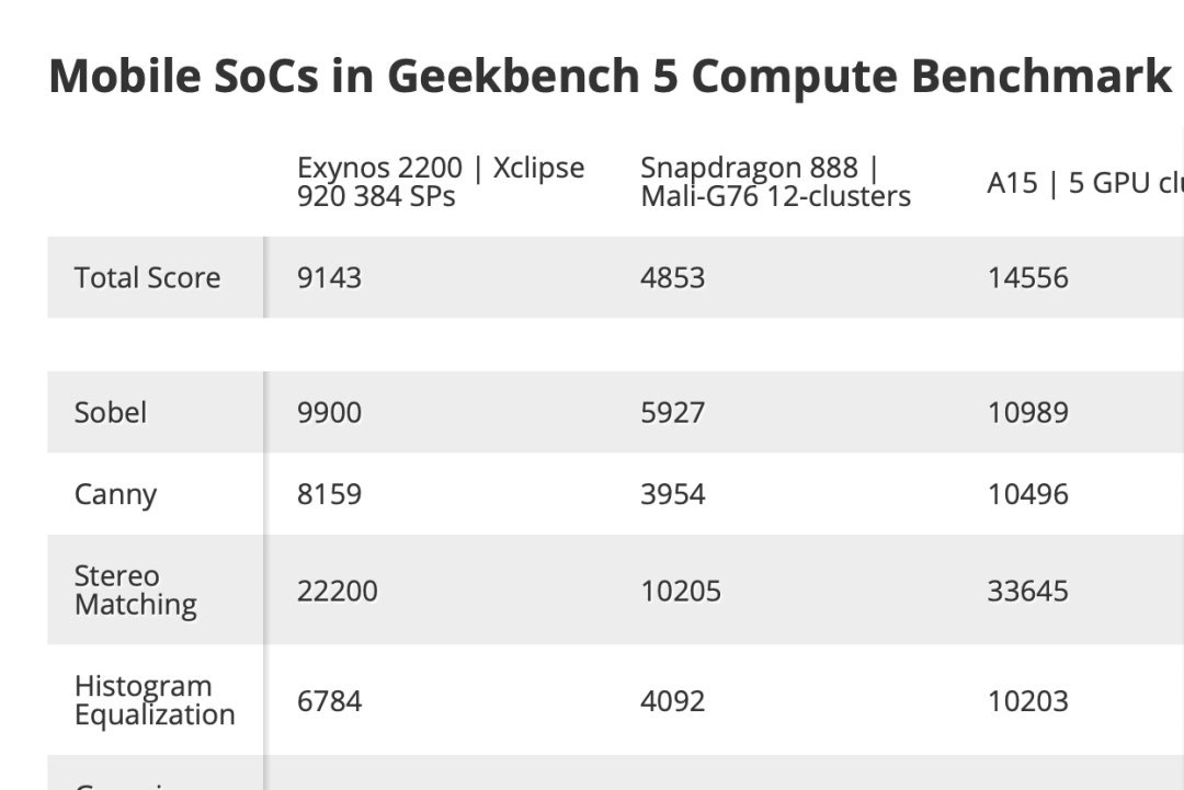 在 Geekbench OpenCL 跑分中,Xclipse 920 得分 9143 分。外媒的测试数据显示,Xclipse 920 GPU 的 OpenCL 总分比三星 Galaxy S21 中使用的骁龙 888 高出 1 倍,但落后于为 iPhone 13 Pro 搭载的 Apple A15。(来源:IT之家)