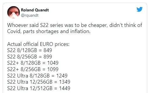 Quandt 称,在欧洲 S22 售价 849 欧元(约 6112.8 元人民币)起,S22 Plus 售价 1049 欧元(约 7552.8 元人民币)起,而 S22 Ultra 售价 1249 欧元(约 8992.8 元人民币)起。