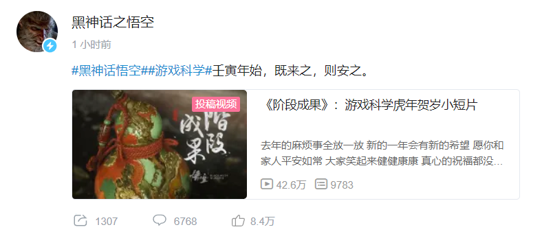 今天,由 @游戏科学 GameScience 开发的西游题材单机・动作・角色扮演游戏《黑神话:悟空》发布了“《阶段成果》:游戏科学虎年贺岁小短片”。