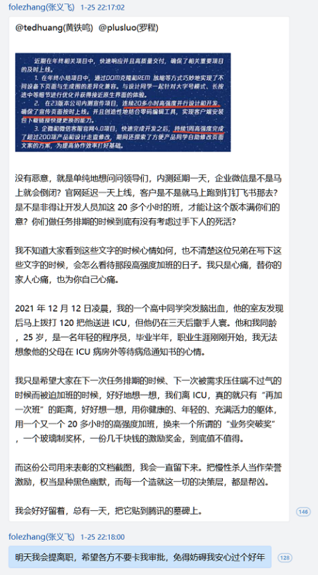 近日,多个社交媒体大 V 爆料:昨天深夜,腾讯企业微信的一名应届生员工在部门内部大群中,因“赶版本”导致的高强度加班问题,发消息怒怼管理层。