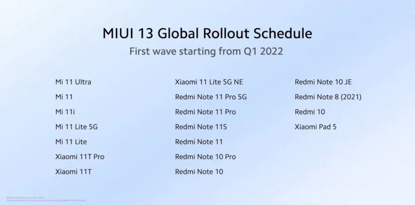 根据更新路线图,2022 年第一季度,小米 11 系列海外版、小米 11T / Pro,以及 Redmi Note 11 系列、Note 10 系列的海外版,也将获得更新。此外,小米 Pad 5 也会获得推送。