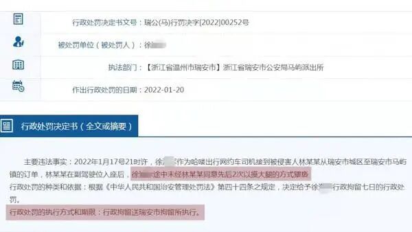 据浙江政务公开网,一网约车司机接到被侵害人林某某的订单,林某某在副驾驶位入座后,该司机未经同意先后2次以摸大腿方式猥亵乘客。目前,司机被行拘7日。
