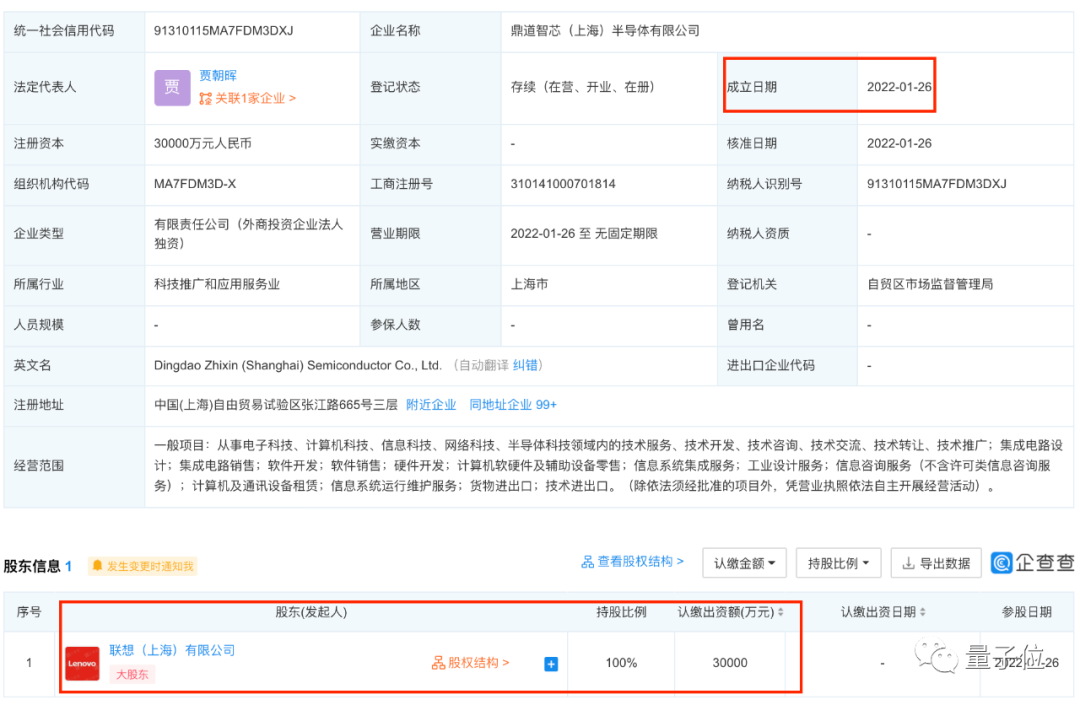 近日,由联想 100% 控股,名为鼎道智芯(上海)半导体有限公司现已正式成立。