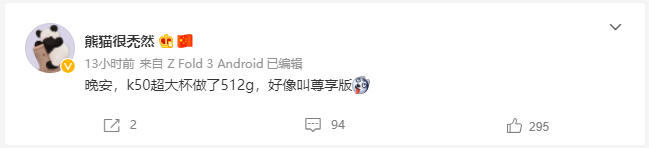 数码博主@熊猫很秃然 发博爆料,Redmi K50 超大杯将会采用 512G 大内存版本,命名为尊享版。