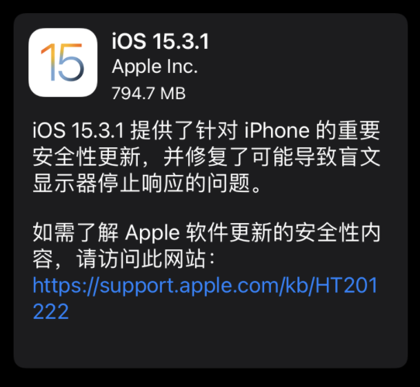 苹果官方更新日志显示,iOS 15.3.1 提供了针对 iPhone 的重要安全性更新,并修复了可能导致盲文显示器停止响应的问题。