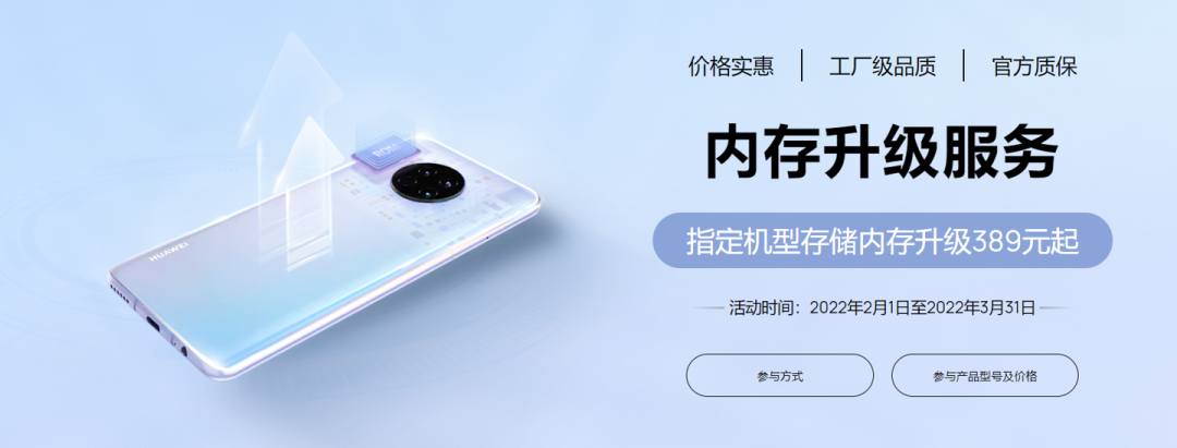 从官方的描述来看,可对手机的存储空间进行升级,而非升级运行内存,新增支持 P40、P40 Pro 等机型,活动时间为 2 月 1 日到 3 月 31 日,全国 300 + 城市 1900 余家华为客户服务中心提供服务。