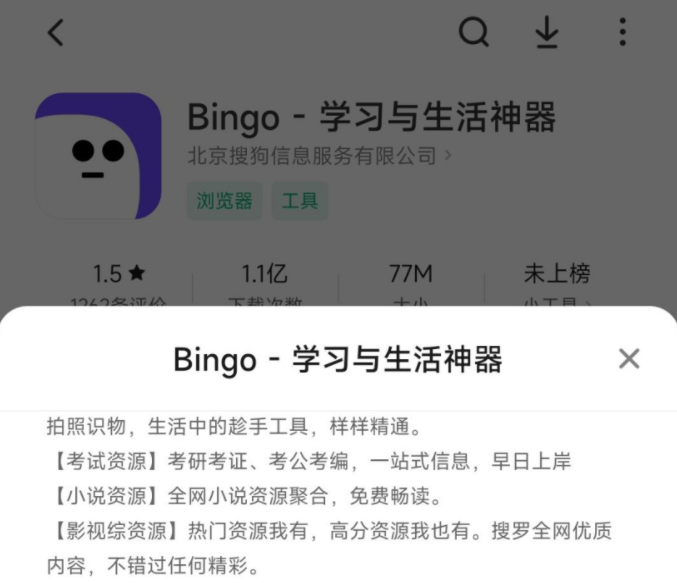 今天,这一变化已经正式实施,应用商店中的搜狗搜索 App 已经升级为 Bingo App,号称“学习与生活神器”,提供搜索、小说、学习馆、健康馆、资源馆等功能。(来源:IT之家)