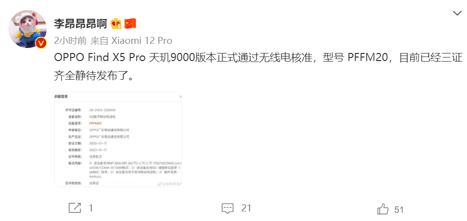 据数码博主 @李昂昂昂啊 爆料,OPPO Find X5 Pro 天玑 9000 版本正式通过无线电核准,型号为 PFFM20,目前已经三证齐全、静待发布了。