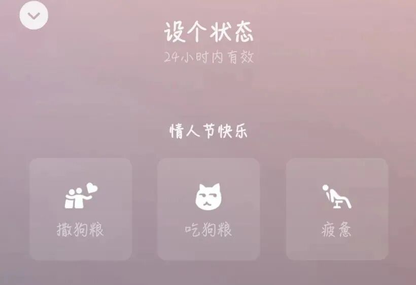 此外,微信为了今天还特意上线了三个新的情人节限定状态,分别为“撒狗粮”“吃狗粮”以及“疲惫”,生动形象,先吃为敬。(来源:IT之家)