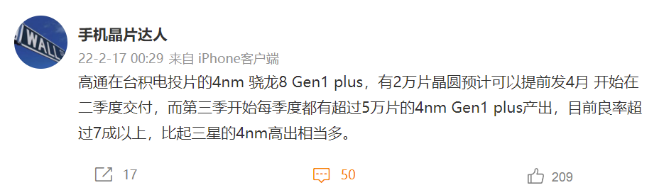今日,业内人士 @手机晶片达人 通过社交媒体透露,高通在台积电投片的 4nm 骁龙 8 Gen1 Plus,有 2 万片晶圆预计可以提前发出,并开始在二季度交付。