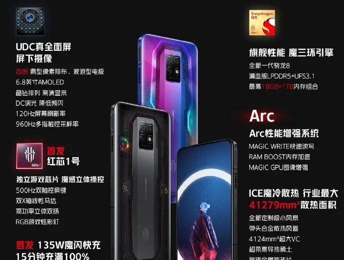 性能方面,红魔7 Pro 搭载了全新一代骁龙 8 旗舰芯片,还有满血 LPDDR5 内存和 UFS 3.1 闪存。最高还可以选择 18GB+1TB 的内存组合。