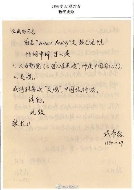 资料显示,1990年11月27日,钱学森在写给汪成为院士的信中提到,“Virtual Reality”中文译名可以是“人为景境”或“灵境”,并表示他“特别喜欢‘灵境’,中国味特浓”。