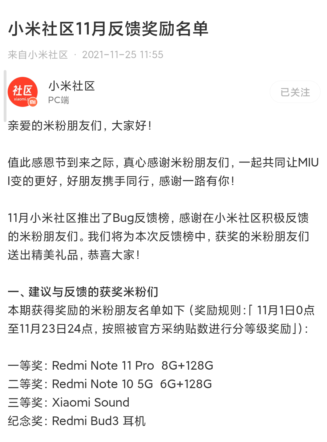本次小米 BUG 反馈活动一等奖为 Redmi Note 11 Pro 8G+128G,二等奖为 Redmi Note 10 5G 6G+128G,三等奖为 Xiaomi Sound 智能音箱,纪念奖为 Redmi Bud 3 耳机。
