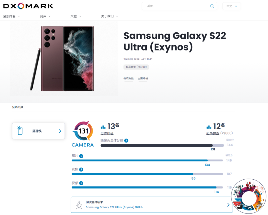 今天 DXOMARK 网站发布了 Samsung Galaxy S22 Ultra (Exynos) 的相机评测分数,摄像头总体分数为 131 分,总体排名第 13 名。照片分数为 134 分,变焦分数为 86 分,视频分数为 114 分。