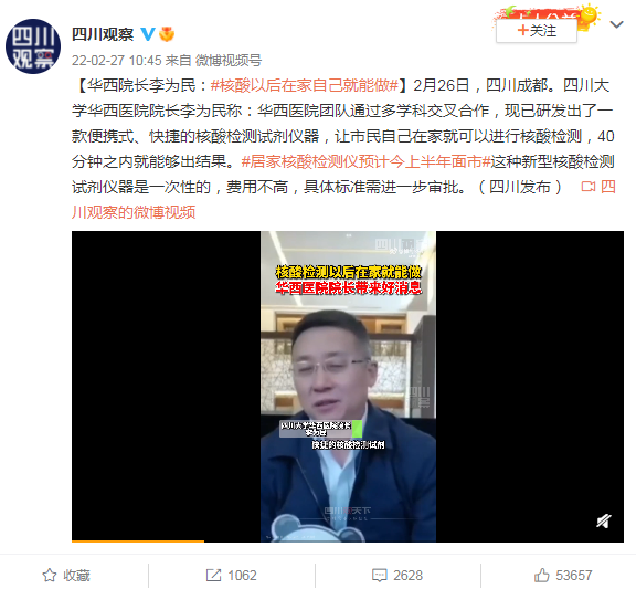 2 月 26 日,四川大学华西医院院长李为民接受采访时称,现已研发出了一款便携式、快捷的核酸检测试剂仪器,在家就可以进行核酸检测。