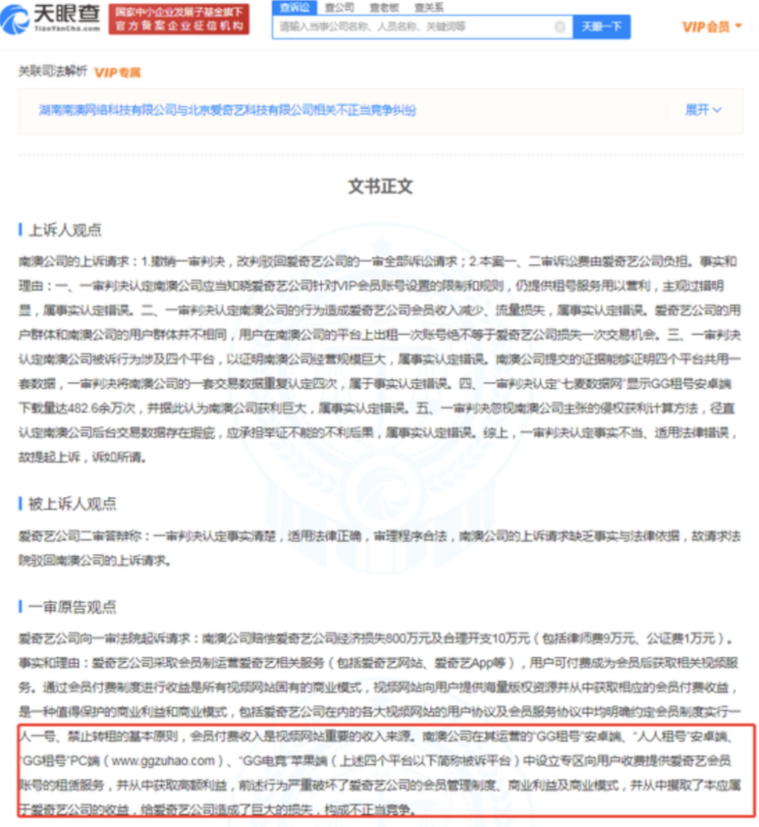 文书显示,一审原告爱奇艺公司诉称,南澳公司在其运营的多个租号平台中向用户收费提供爱奇艺会员账号的租赁服务,并从中获取高额利益。被告南澳公司诉称,涉案爱奇艺账号为用户上传,其主营业务为游戏账号租赁,视频账号租赁占比小,不会对爱奇艺的经营产生影响等。