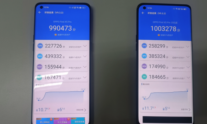 两部手机跑分时都开启了高性能模式,从跑分结果来看,OPPO Find X5 Pro 天玑版的安兔兔综合成绩超过百万,达到了 1003278 分,略微高于搭载骁龙 8 的 OPPO Find X Pro 成绩,后者的分数也达到了 990473 分。具体来看,OPPO Find X5 Pro 天玑版的 CPU 成绩要高于骁龙 8,但 GPU 成绩不及后者。(来源: IT之家)