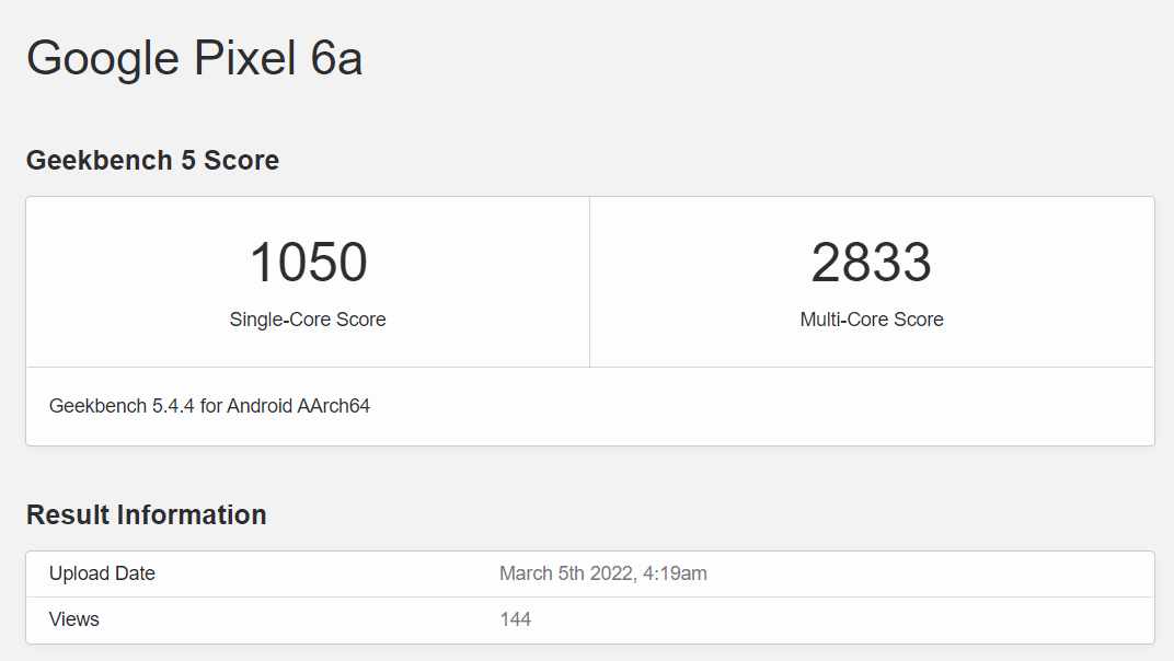 近日,谷歌 Pixel 6a 已经出现在了 Geekbench 5 跑分中。Pixel 6a 代号“Bluejay”,有黑色、白色和绿色版本,存储容量为 128GB。该机单核跑分 1050,多核跑分 2833。
