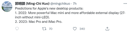 郭明錤通过 Twitter 表示,苹果今年将推出更强大的 Mac mini 和更实惠的外部显示器。其中,新款显示器拥有 27 英寸的屏幕尺寸,但并未采用 mini-LED。