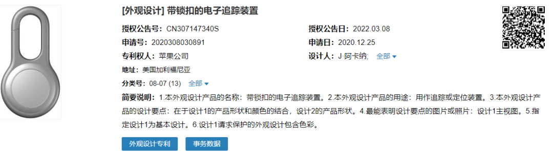 从专利外观图可以看到,该装置类似于 AirTag 加上了一个锁扣,目前尚不清楚是否将会推出。(来源:IT之家)
