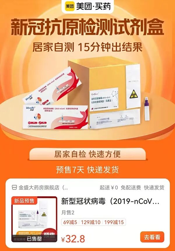 据报道,美团买药已经可以预约购买新冠抗原自测产品。登陆美团App或美团外卖App进入“美团买药”频道后,点击“新冠自测”专区,就能找到相关产品。