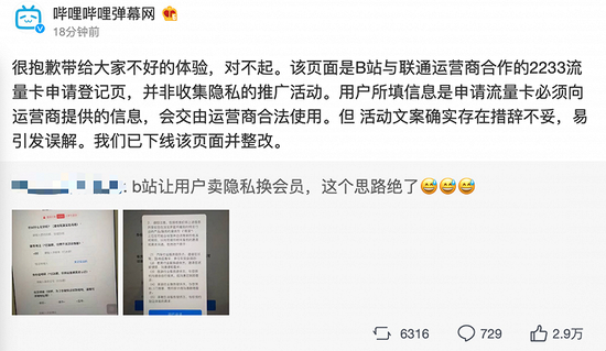 针对日前有网友发文质疑B站让用户卖隐私换会员一事,B站在其官方微博回应称,该页面是B站与联通运营商合作的2233流量卡申请登记页,并非收集隐私的推广活动。用户所填信息是申请流量卡必须向运营商提供的信息,会交由运营商合法使用。