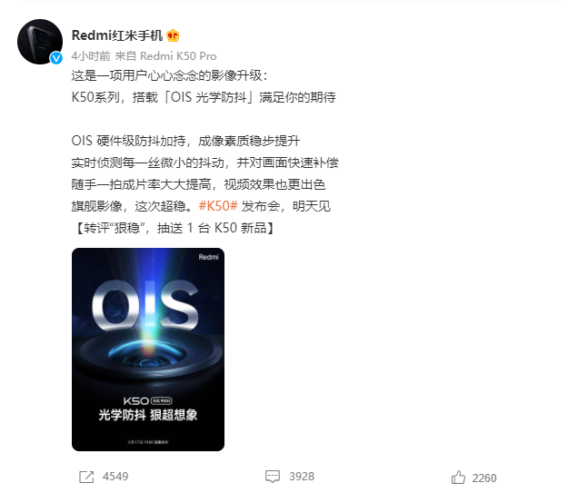 近日,Redmi 官方表示,这次 Redmi K50 系列加上了硬件级的 OIS 光学防抖,成像素质进一步提升。镜头的每一次微小的抖动都被实时侦测到,并对画面快速补偿,成片率大大提高。