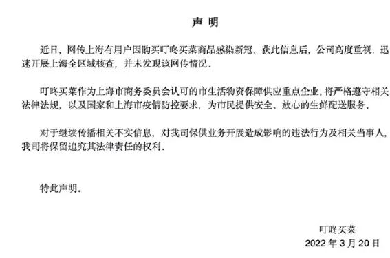 叮咚买菜发布声明称,近日,网传上海有用户因购买叮咚买菜商品感染新冠,获此信息后,公司高度重视,迅速开展上海全区域核查,并未发现该网传情况。