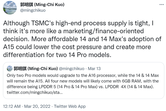 3月13日,天风国际分析师郭明錤通过Twitter表示,iPhone 14系列中,只有两款Pro型号会升级到A16处理器,iPhone 14和iPhone 14 Max仍将搭载A15。