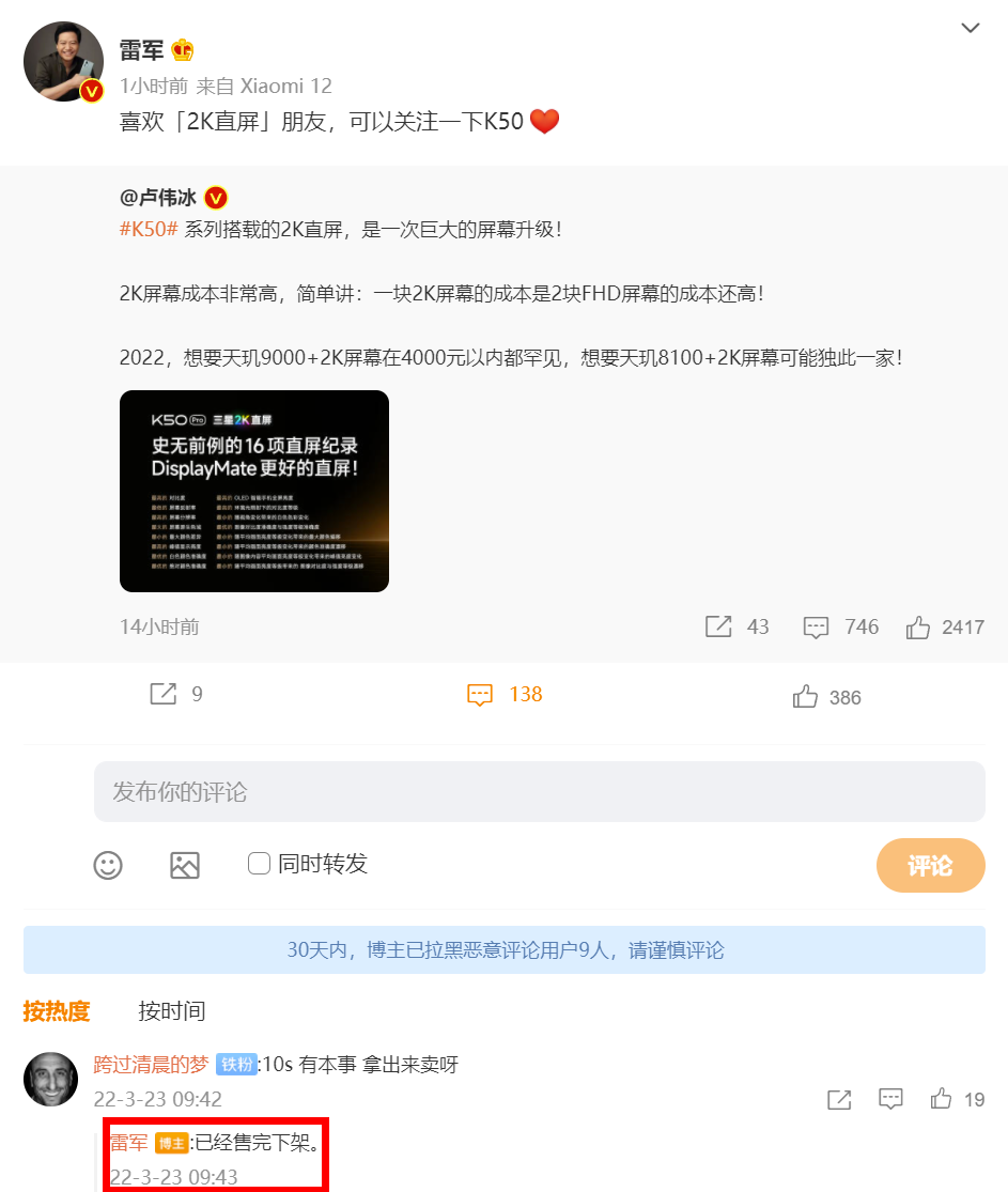 今日上午,小米创办人、董事长兼 CEO 雷军在与网友互动时表示,小米 10S 已经售完下架了。