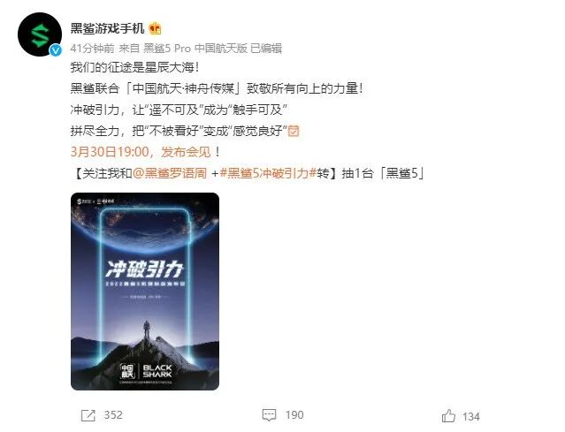 3 月 25 日消息,黑鲨游戏手机官方微博宣布,黑鲨联合「中国航天·神舟传媒」致敬所有向上的力量。