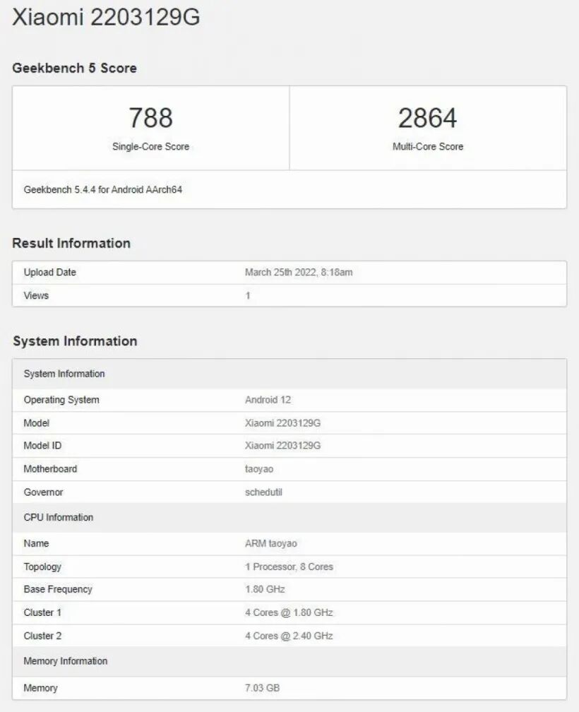 小米公司还可能在研发一款定位更低的小米 12 Lite 手机。这款型号为 2203129G 的手机出现在 Geekbench 跑分网站上,显示搭载了骁龙 778G 芯片和 8GB 内存选项。