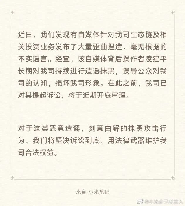 声明表示:近日,我们发现有自媒体针对我司生态链及相关投资业务发布了大量歪曲捏造、毫无根据的不实谣言。经查,该自媒体背后操作者凌建平长期对我司持续进行造谣抹黑,误导公众对我司的认知,损坏我司形象。在此之前,我司已对其提起诉讼,将于近期开庭审理。
