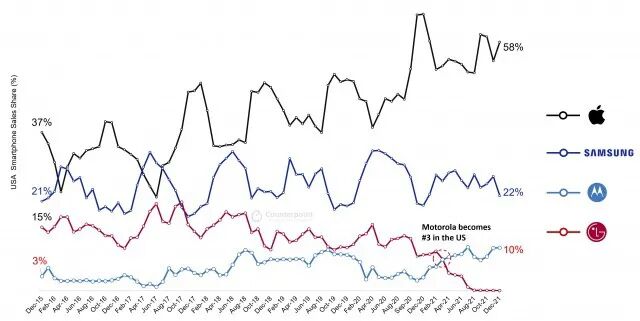 2021 年,摩托罗拉智能手机的销售率增长了 131%,市场份额达到了 10%,这是摩托罗拉公司的历史新高。苹果以 58% 的份额遥遥领先,三星排在第二,份额为 22%。