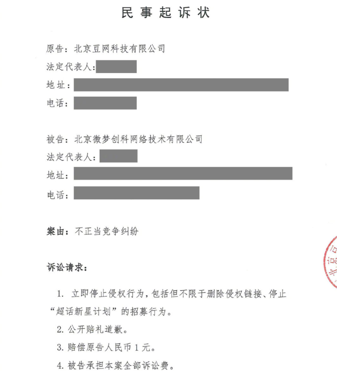 30日晚间,豆瓣官方在微博发布了多张图片,北京豆网科技有限公司(豆瓣)起诉北京微梦创科网络技术有限公司(微博)不正当竞争。