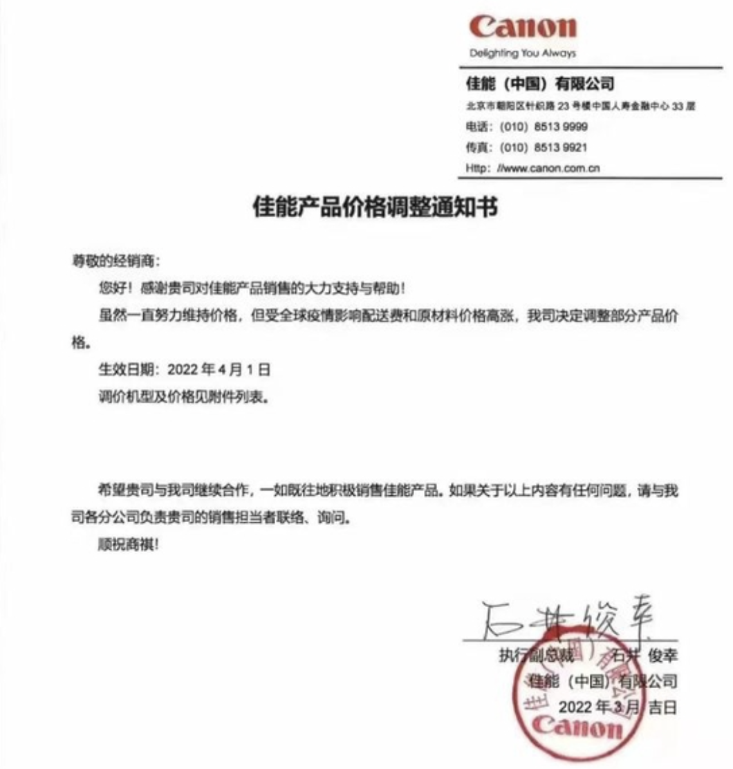 据佳能中国发给经销商的通知书显示,受全球疫情影响配送费和原材料价格高涨,佳能中国决定将从4月1日起对部分产品进行价格调整。
