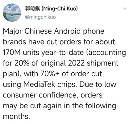 近日,天风国际分析师郭明錤在推特发布消息,中国主要安卓手机品牌今年已削减约 1.7 亿部订单,占原 2022 年出货计划的 20%,其中 70% 以上都使用联发科芯片。由于消费者信心低下,未来几个月订单可能会再次减少。