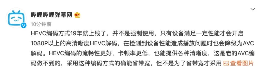 对此,B站官方进行了回应,称未在 Web 端强行开启 HEVC 播放,设备满足一定性能才会开启。