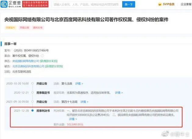 央视国际网络有限公司与北京百度网讯科技有限公司著作权权属、侵权纠纷民事一审判决书公开。