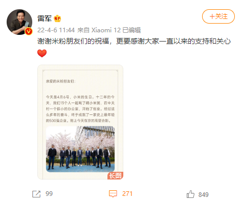 小米科技创始人雷军微博晒小米今日在京高管合影并发文,称今天是小米成立12周年,也是一年一度的“米粉节”。雷军表示,12年前的近日,雷军等13个人一起喝了碗小米粥,在中关村开始创业,经过多年奋斗,小米终成史上最年轻的500强的企业。