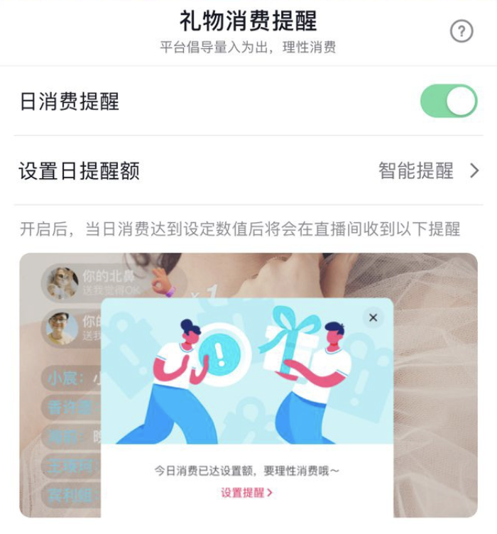 在观看直播时,用户可以从右下角进入礼物消费管理,设置自己的单日消费提醒额度。一旦用户当天礼物打赏金额达到所设置的额度,系统就会对用户进行弹窗,提示其理性消费。
