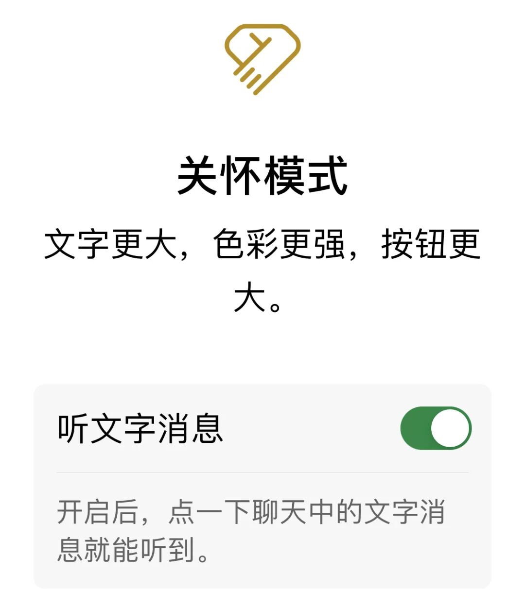 据微信派公众号表示,微信关怀模式现在支持听文字消息了。