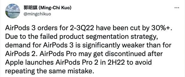近日,知名分析师郭明錤(Mig Chi Kuo)发推文称,AirPods 3是苹果“失败的产品细分策略”。据称,人们对它的需求比AirPods 2“弱得多”,2022年第二和第三季度,AirPods 3代的订单量已被砍掉30%以上。