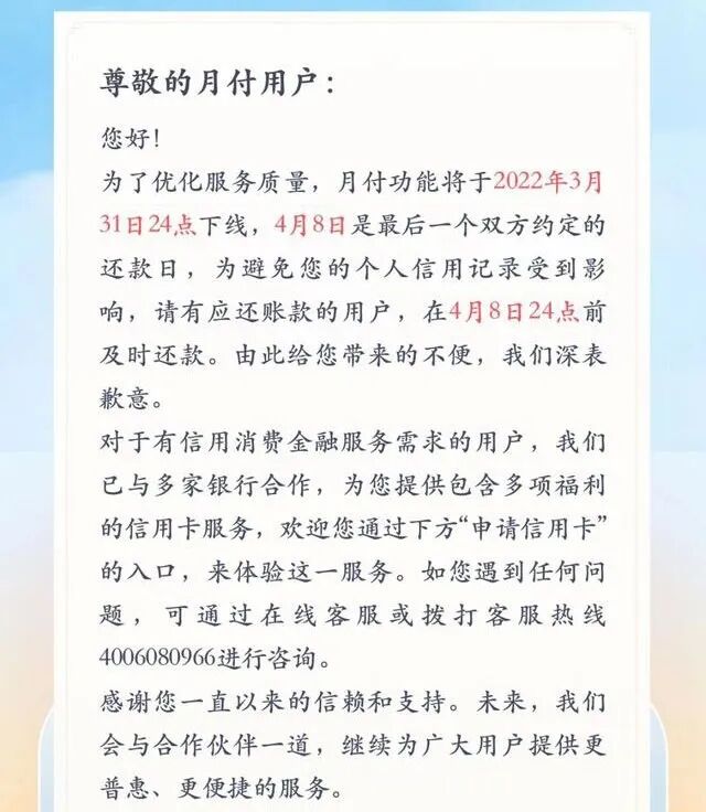 滴滴月付日前发布公告称,为了优化服务质量,月付功能在 2022 年 3 月 31 日 24 点下线,4 月 8 日将是最后一个双方约定的还款日。