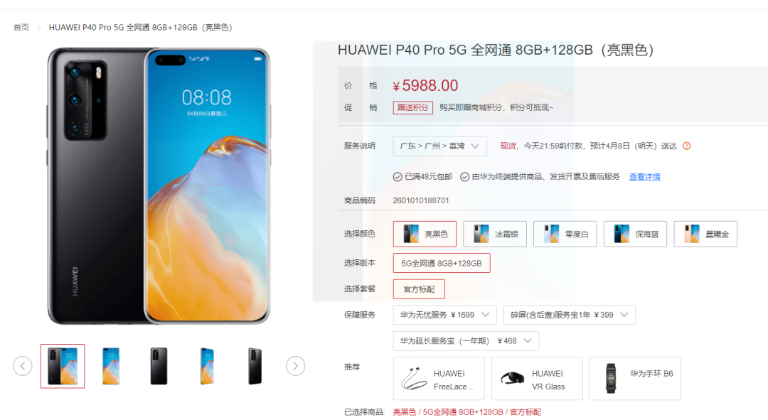 据悉,华为商城重新上架了华为 P40 Pro 8GB+128GB 版本,提供亮黑、冰霜银、零度白、深海蓝、晨曦金五款配色,目前官方售价 5988 元,与当初发布相同。